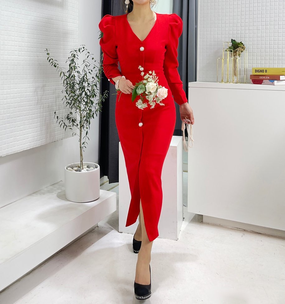 브이넥과 퍼프소매디자인의 롱한 길이감이