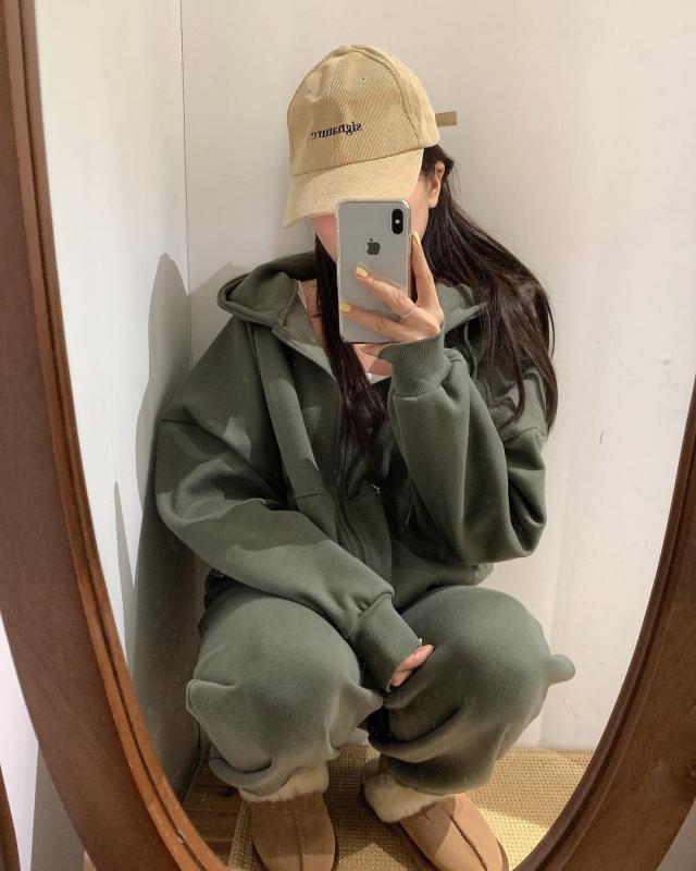 입어보니 생각했던 것보다 핏이 더 예뻐서 놀란 셋업아이템🤍 기본핏 조거라 키가 작아보이지 않아서 좋았구용! 후드집업은 왜인지 모르게 여리해 보였어요,,,🫶