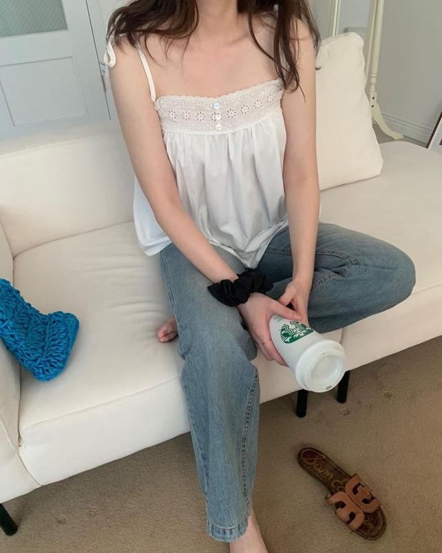 레이스 펀칭 끈나시🤍 어깨 끈은 리본으로 묶어 길이 조절이 가능해 체형에 맞게 사이즈 조절 할 수 있어여!!부담스럽지 않게 편안하게 입으실 수 있답니다🙃