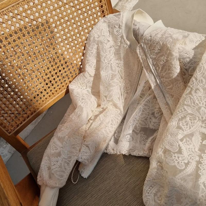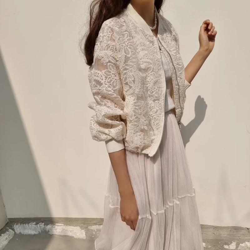 우아함과 여성스러움을 품고 있는 레이스 오간자 소재감과 캐주얼무드가 느껴지는 블루종 디자인이 만나 다양하게 스타일링 하기
