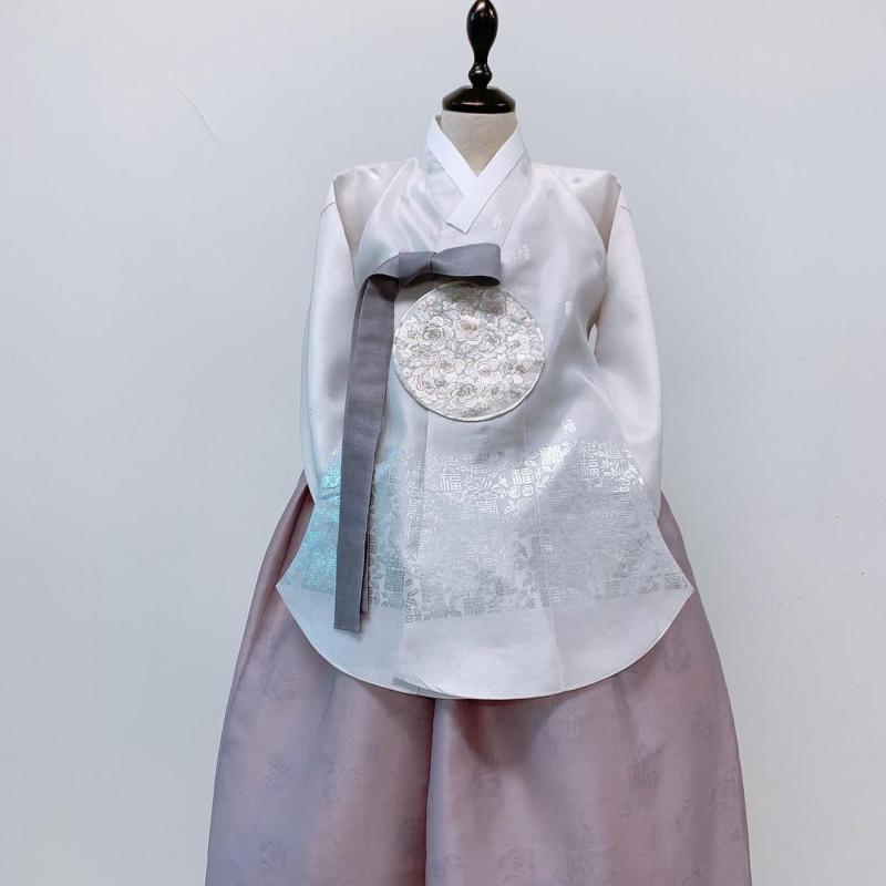 백색명주에 전체 은장이 찍혀있는 당의와 연보라빛 자가드 이중치마입니다, 160이상 55~66" 추천드릴게요.