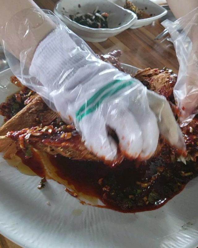통멜젓, 갈치속젓, 쌈장의 세가지 찬과 나물이 나오고 주인공인 우럭 통 튀김이 등장한다. 음식을 가져다주신 아주머니께선 사진 찍을 타이밍을 주고 바로 시크하게 비닐장갑을 끼고 살을 발라주신다.