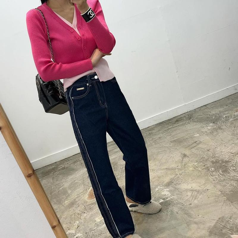 꽈리 데님 배색 가디건&로엔 양면 패드티&사이드턱 배기 데님 팬츠