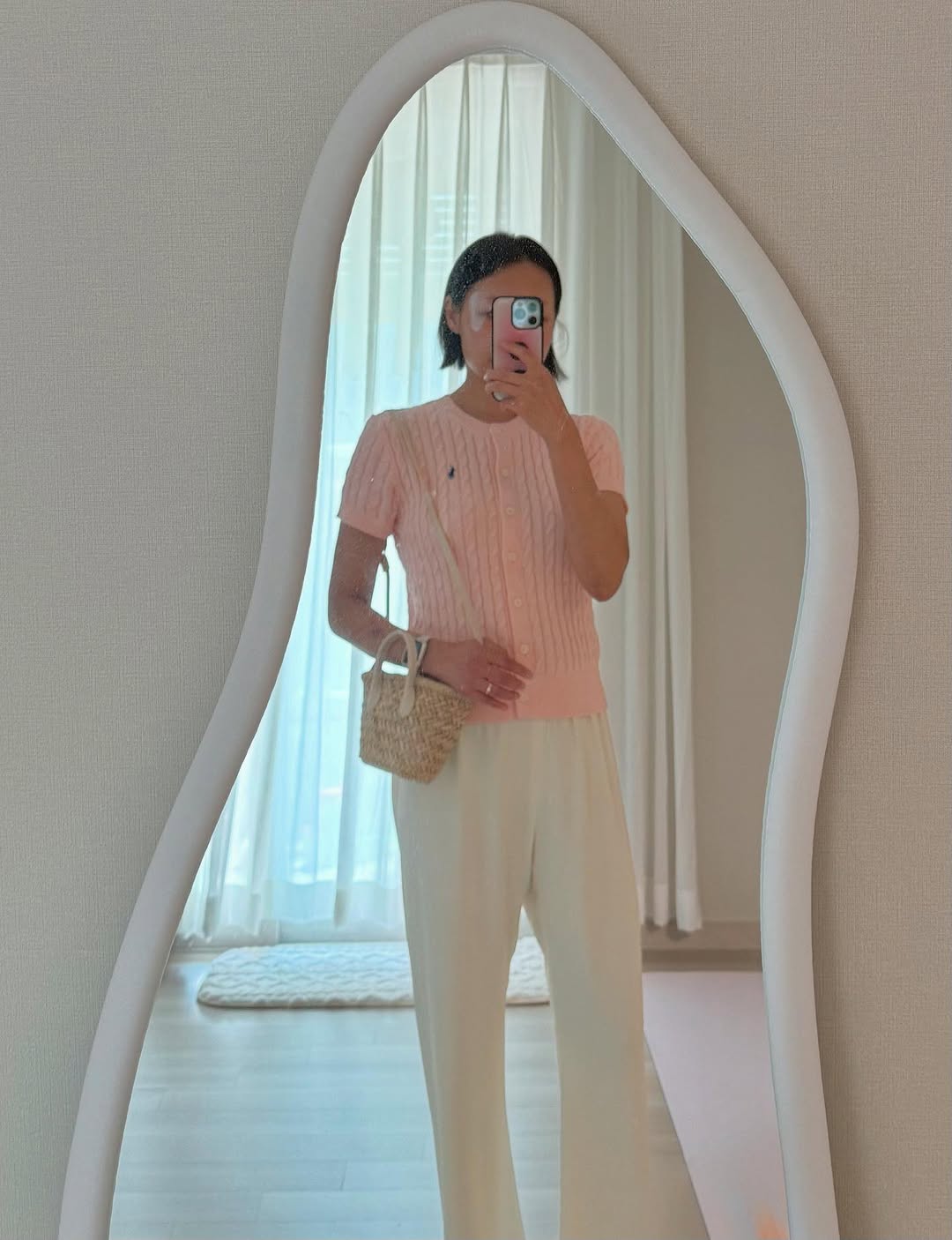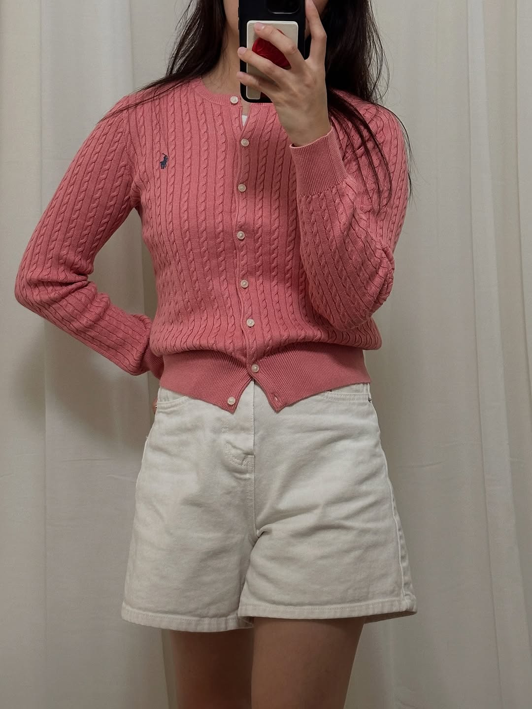 이날 제가 데려온 아이템은 바로 요 폴로 랄프로렌 케이블 라운드 가디건이에요. 러블리한 연핑크 컬러와 깔끔한 케이블 짜임이 정말 사랑스러웠어요. 🎀💕 S 사이즈를 착용했는데, 힙 위로 살짝 떨어지는 기장감이 데님이나 스커트, 슬랙스 어디에나 잘 어울릴 것 같았어요. 특히 봄, 가을에 실내에서 가볍게 걸치기 딱 좋은 두께감이라 활용도가 정말 높을 것 같아요.
